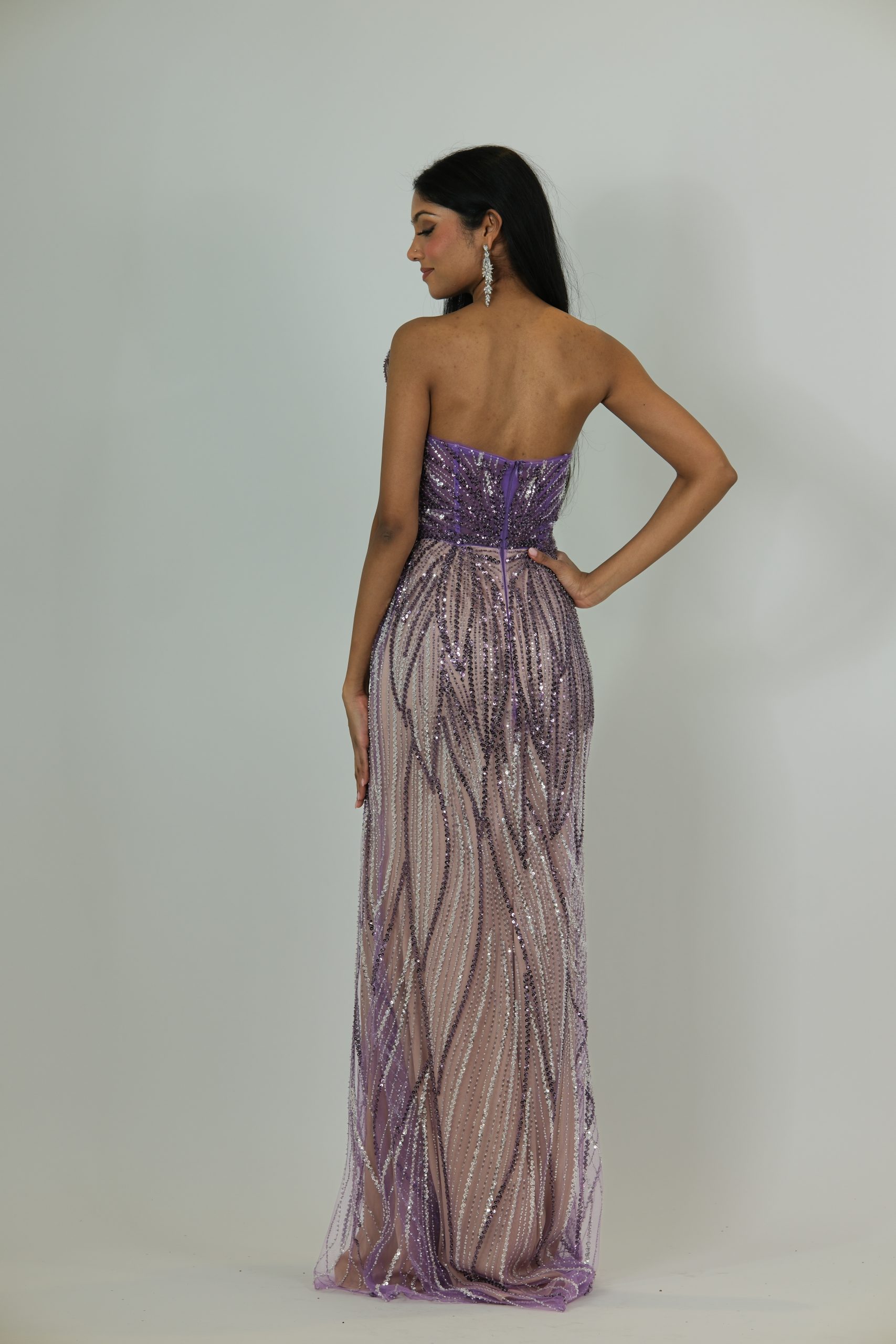 The Auretta Gown blends shimmering purple and soft pink tones in an intricate, leaf-inspired sequin design that contours the body beautifully. With its sculpted sweetheart bodice, subtle illusion details, and a sleek leg slit, this gown delivers elegance with a modern, high-fashion edge. Perfect for prom, galas, or special occasions where you want to shine with a unique two-tone sparkle.
