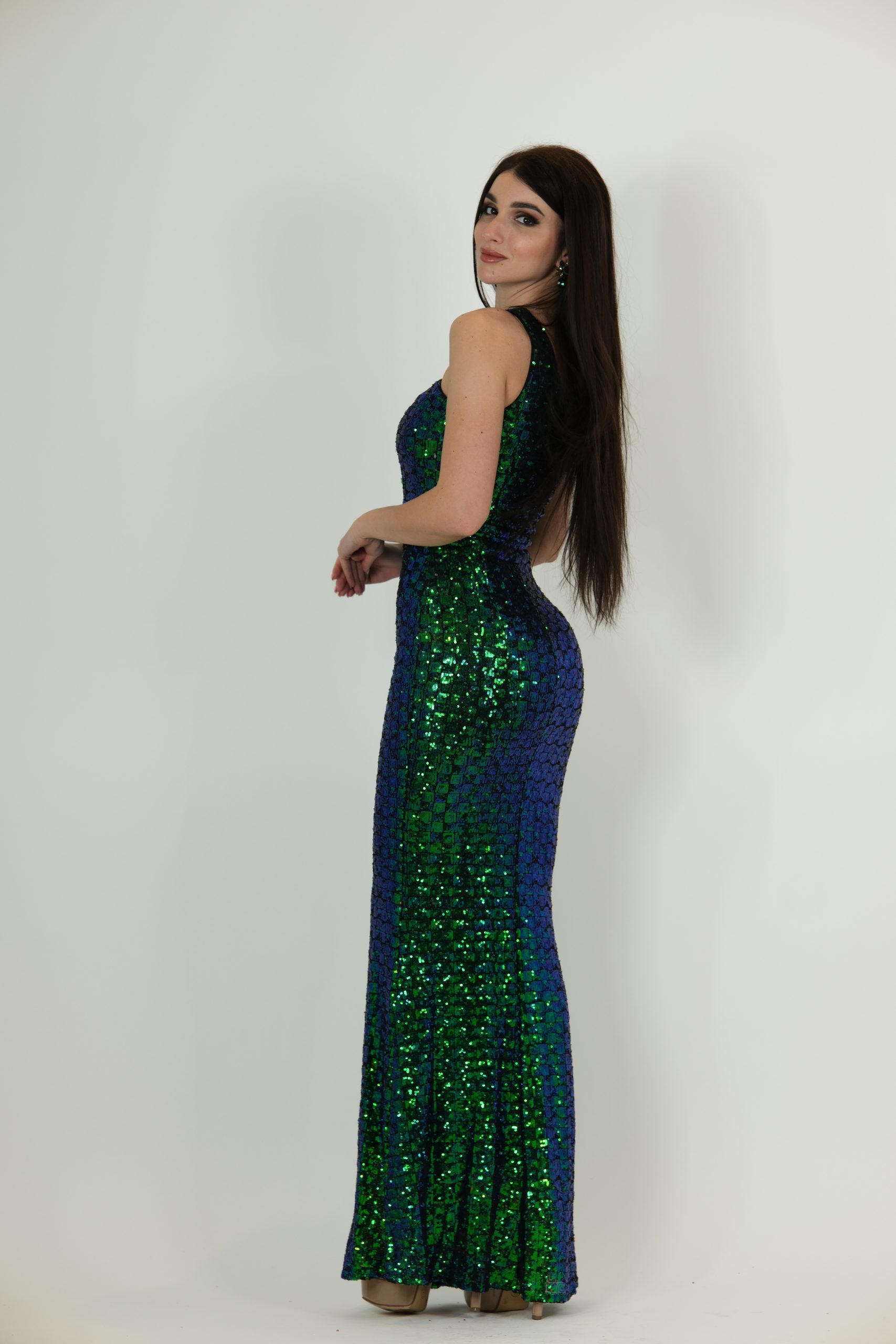 Introducing the Cosima Gown, a bold and elegant one-shoulder evening gown designed to shine. This fitted gown features a striking mix of deep blue and emerald green sequins that catch the light beautifully from every angle. The one-shoulder strap adds a modern touch, while the body-hugging silhouette creates a flattering, snatched shape. Perfect for galas, formal events, and special nights out, the Cosima Gown is confident, glamorous, and impossible to miss.