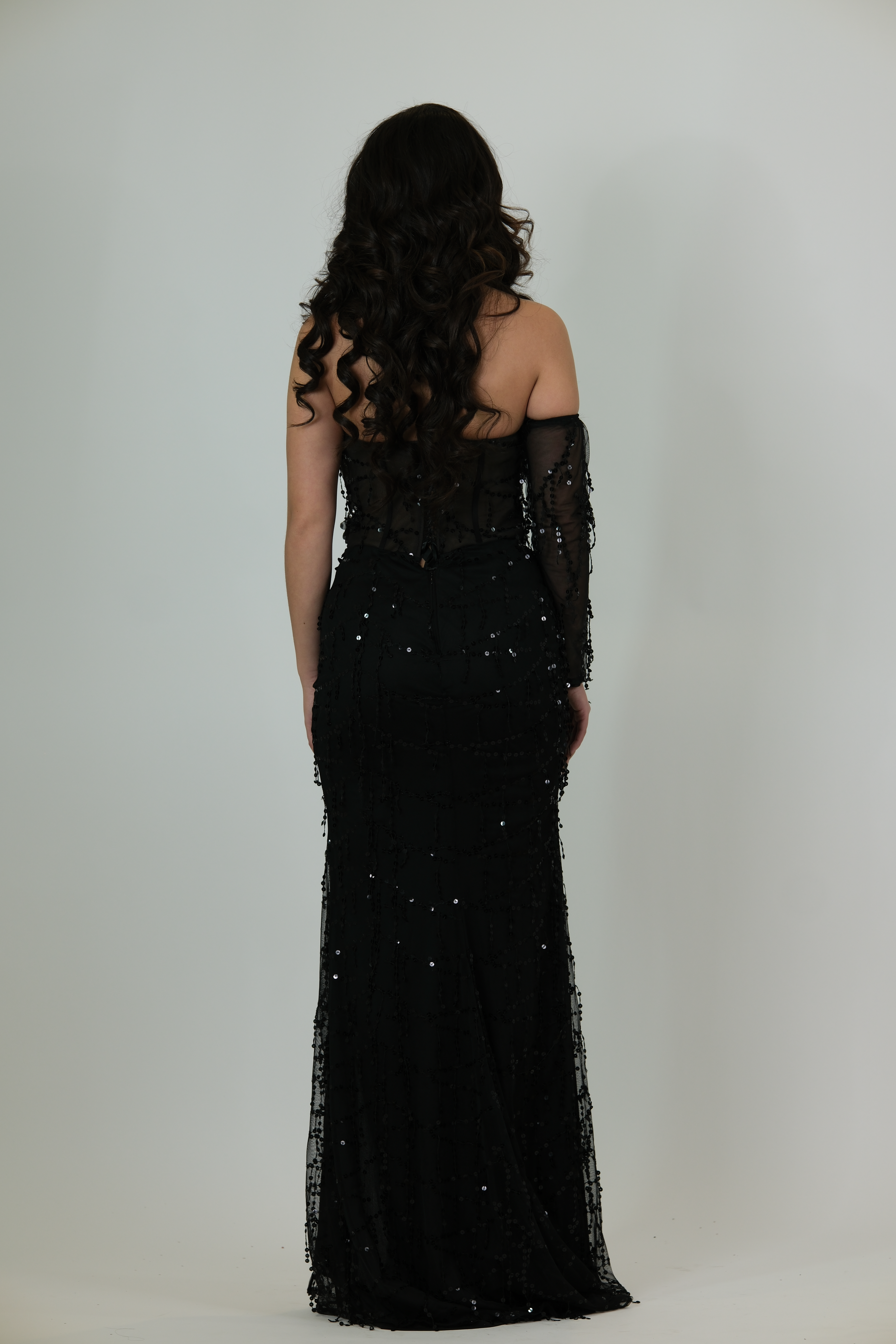 Introducing the Eirene Gown, a dramatic black evening gown that blends elegance with edge. This gown features a sheer corset-style bodice with intricate black applique and sequin detailing, creating a stunning textured look. One side includes a single sheer embellished sleeve, giving the gown a bold asymmetrical touch. The fitted skirt is decorated with cascading beadwork and finished with a high slit for added movement and allure. Perfect for galas, formal events, and nights where you want a dark, glamorous vibe, the Eirene Gown is striking, unique, and unforgettable