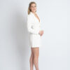 The Georgia Blazer Dress is a white mini dress, with gold buttons and shoulder pads.