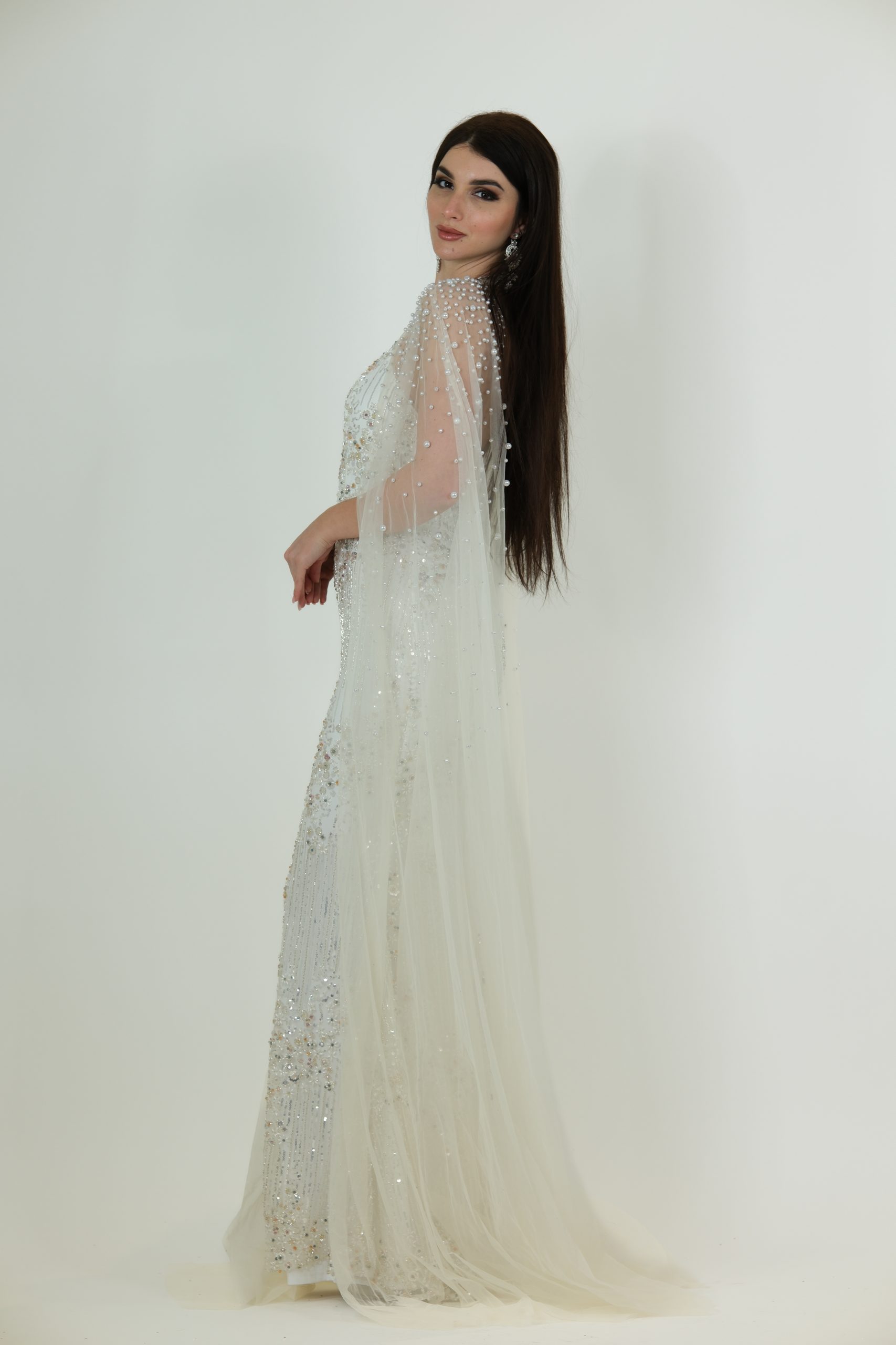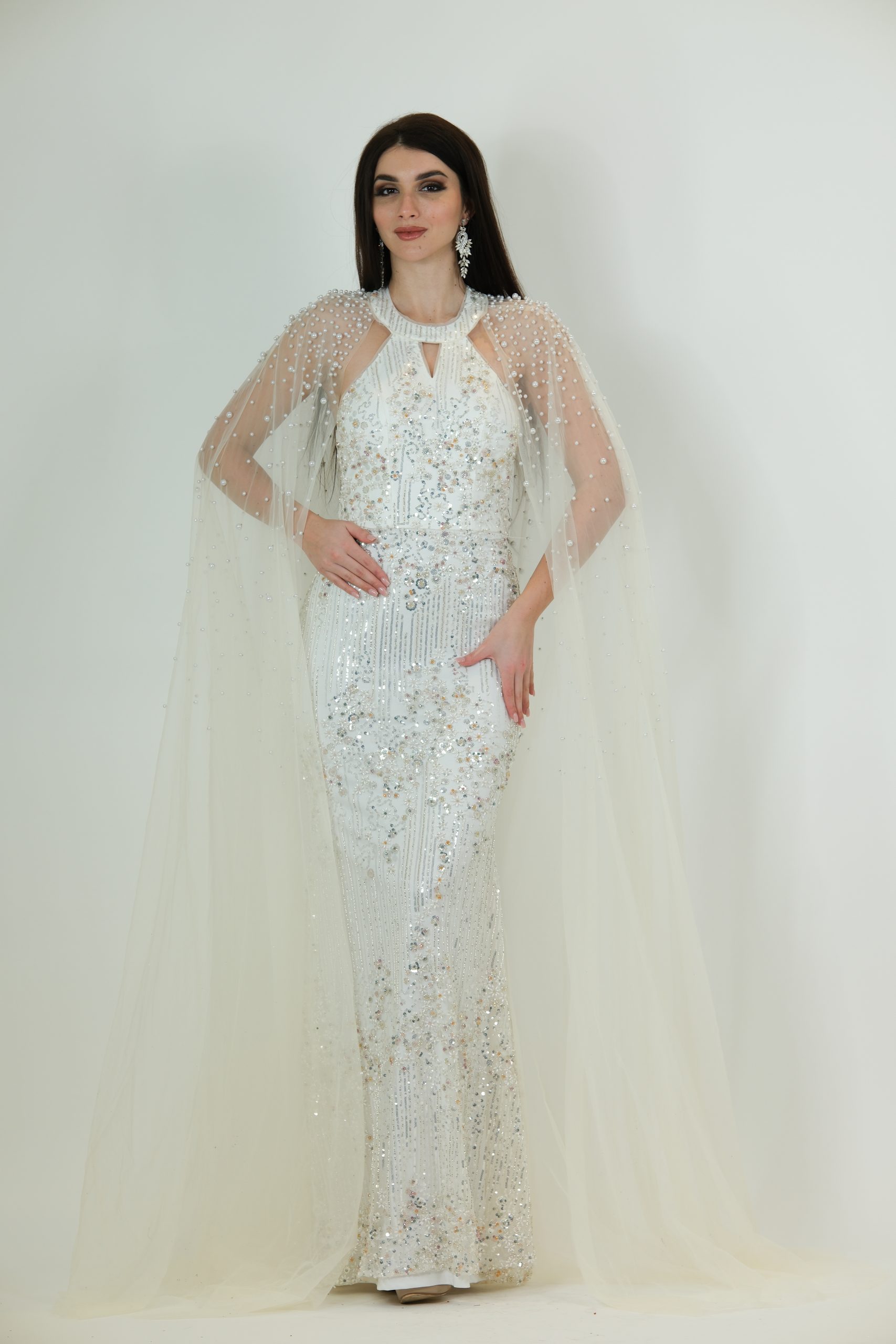 Introducing the Marcella Gown, a breathtaking white and silver evening gown designed for a truly magical entrance. This gown features a fitted sequin-covered silhouette with soft silver detailing that sparkles beautifully under the lights. The standout feature is its sheer pearl-studded cape, which drapes elegantly over the shoulders and flows to the floor, adding a dreamy, angelic touch. With its keyhole neckline and graceful shape, the Marcella Gown is perfect for galas, formal events, and any moment where you want to feel unforgettable.