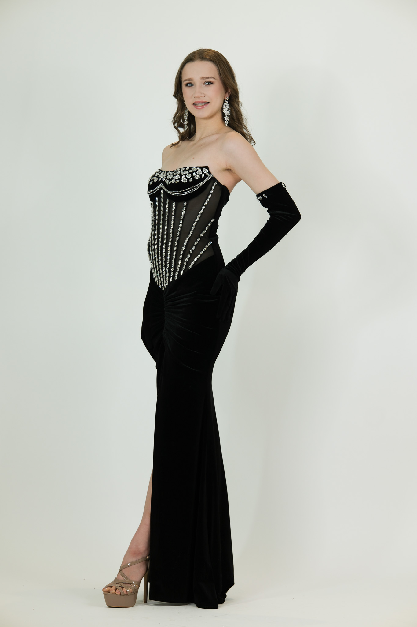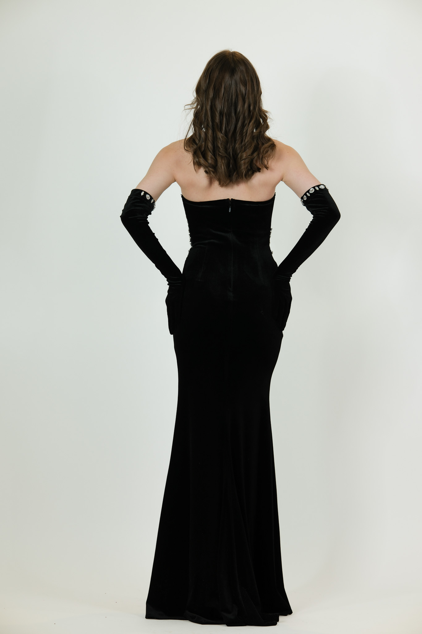 The Saba Gown is a bold, modern black evening dress featuring a structured embellished bodice with sparkling silver detailing that highlights the waist and neckline. The fitted velvet skirt adds elegance, while the front slit brings a sleek, elongated silhouette. Dramatic matching gloves complete the look, making this gown perfect for upscale events, galas, and red-carpet moments.